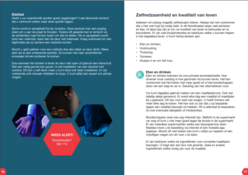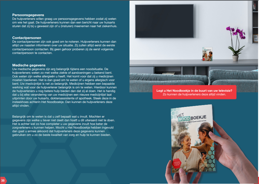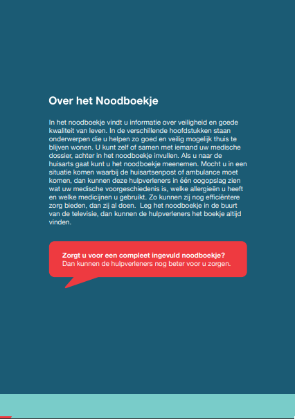 Bovendien biedt het Noodboekje ruimte om uw persoonlijke gegevens en contactpersonen te noteren, zodat in geval van nood direct de juiste persoon benaderd kan worden door hulpverleners zoals ambulancediensten of de politie.