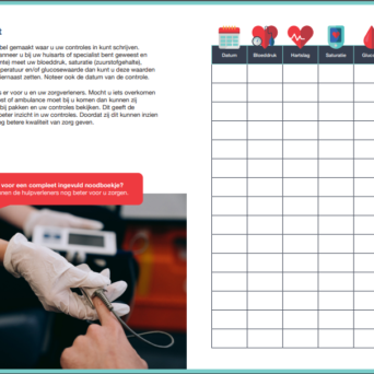- Controlelijst: Een praktische lijst om dagelijks of wekelijks uw vitale functies zoals bloeddruk, hartslag, zuurstofsaturatie, glucose en temperatuur te registreren.