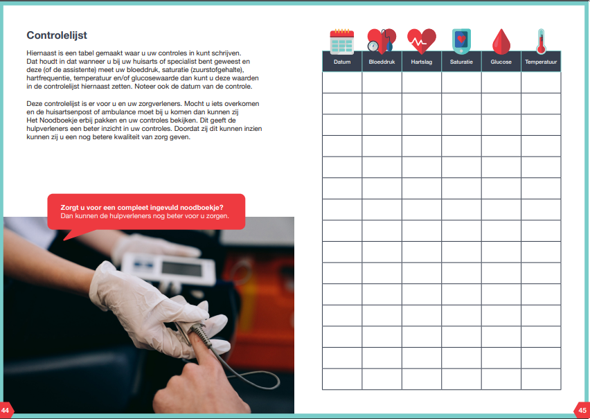 Daarnaast biedt Het Noodboekje ruimte voor het bijhouden van belangrijke medische gegevens zoals: